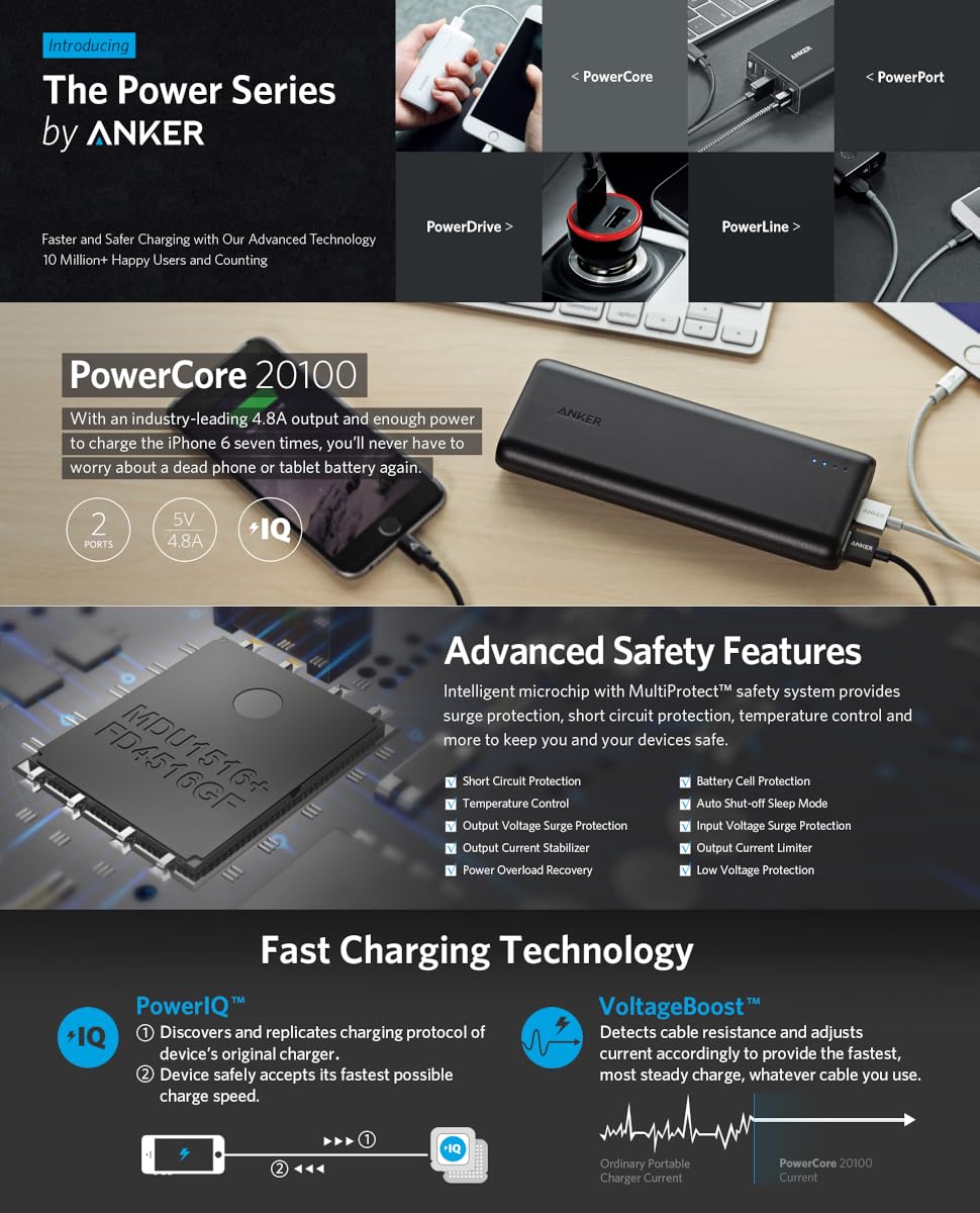 • What You Get: Anker PowerCore 20100 Portable Charger, Micro USB cable, travel pouch, welcome guide, our fan-favorite 18-month warranty and friendly customer service. Lightning cable for iPhone / iPad sold separately.